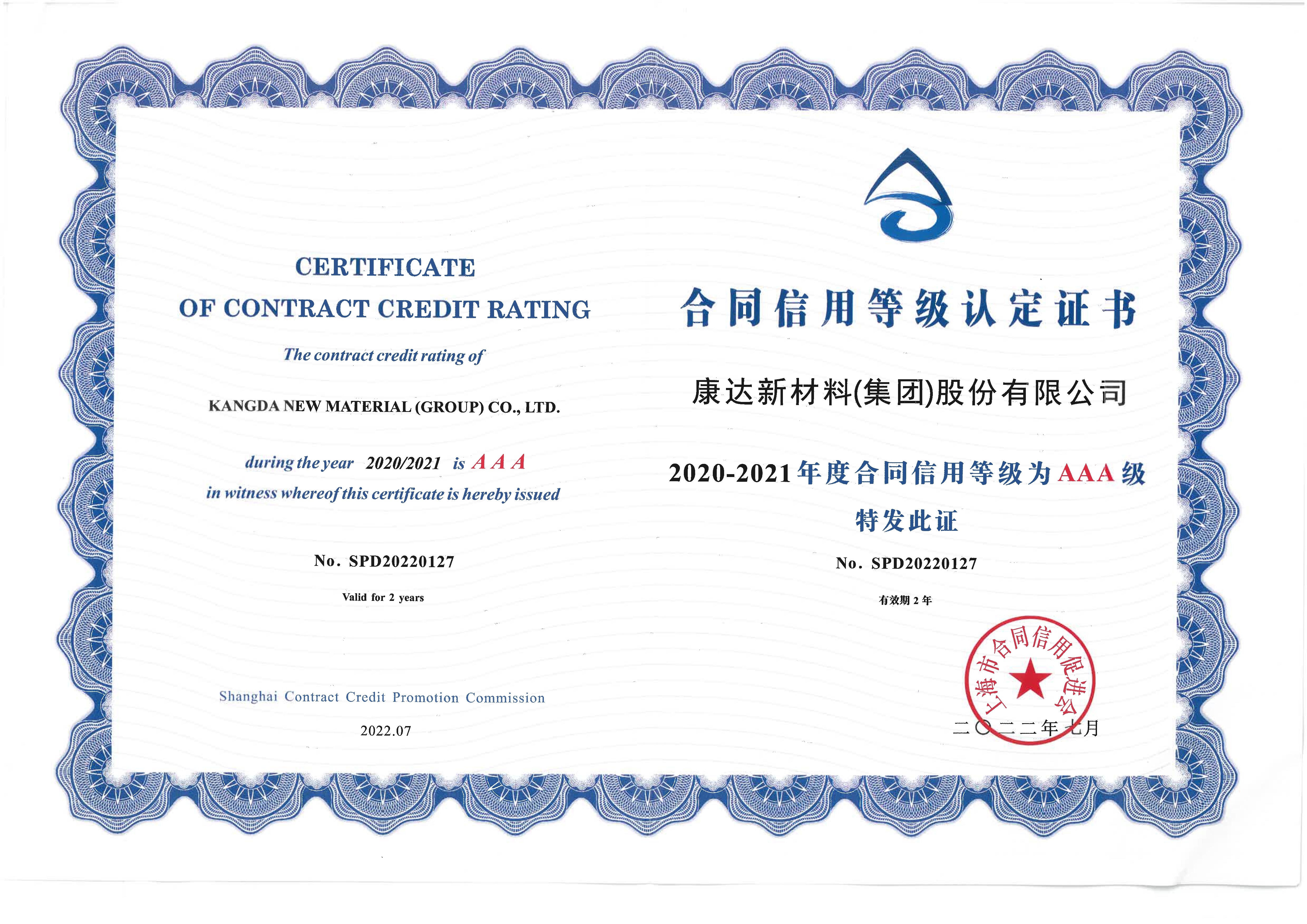 康達(dá)新材料(集團(tuán))股份有限公司榜上有名,再次榮獲“上海市2020-2021年度守合同重信用企業(yè)”稱號(hào),并榮獲AAA級(jí)合同信用等級(jí)認(rèn)定